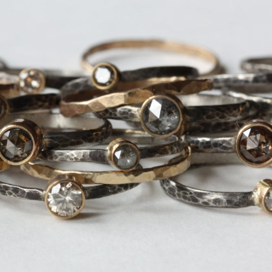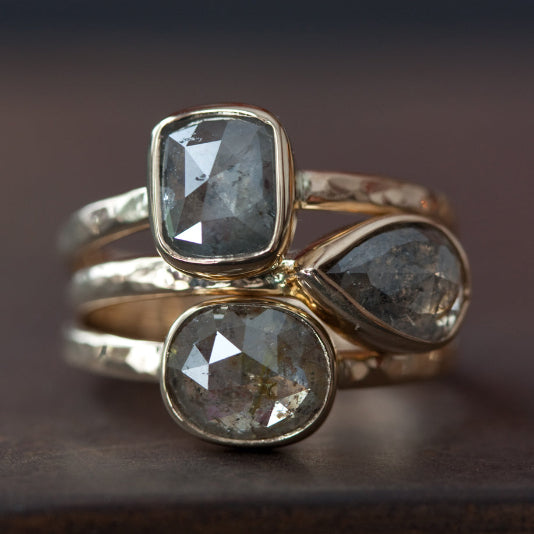 The first engagement rings Alexis ever made consisted of Salt & Pepper Diamonds in a bezel setting with a hammered gold band.