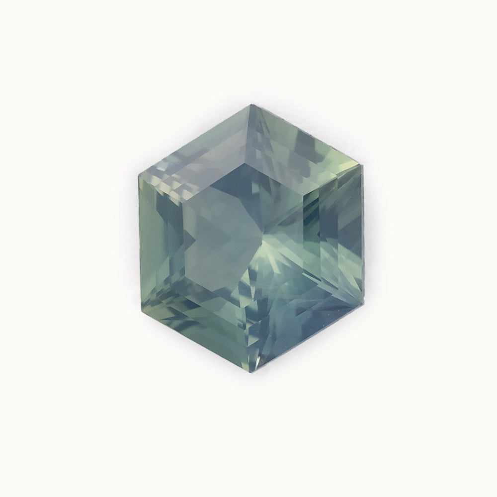 • hexagonal sapphire is hand-set in a prong setting